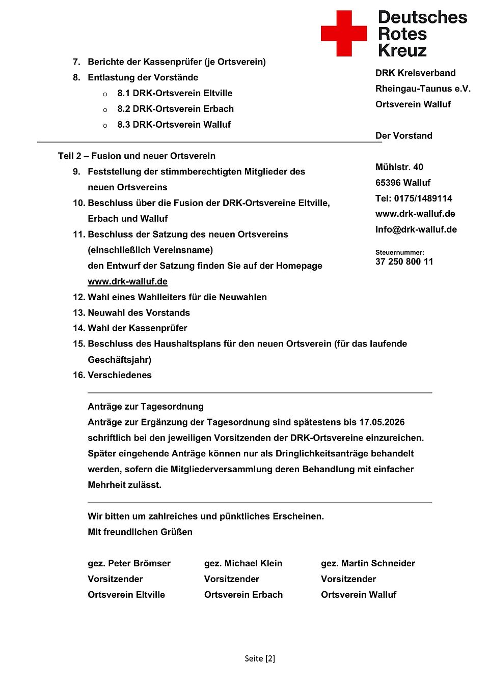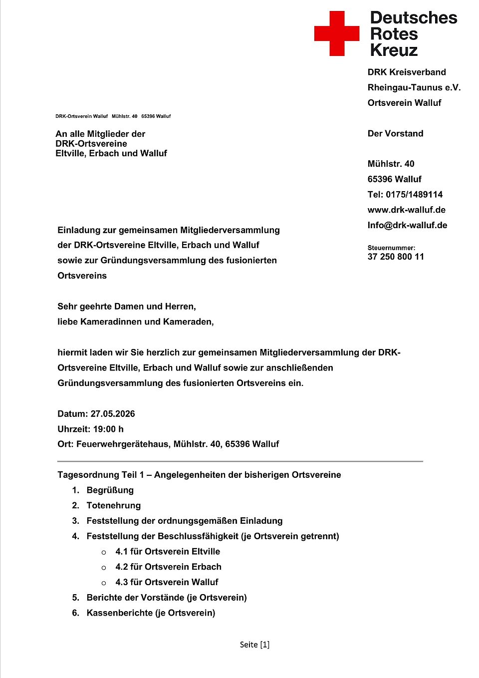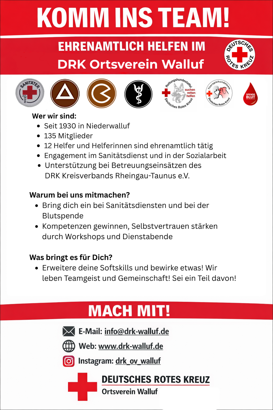 Der DRK-Ortsverein Walluf hat eine lange Tradition. Schon seit 1930 engagieren sich Menschen in und um Walluf für das Deutsche Rote Kreuz. Unser Verein besteht aus 135 Mitgliedern. 12 Helferinnen und Helfer sind ehrenamtlich aktiv. Wir engagieren uns vorwiegend im Sanitätsdienst und in der Sozialarbeit, weiterhin unterstützen wir Betreuungseinsätze des DRK-Kreisverbands Rheingau-Taunus.